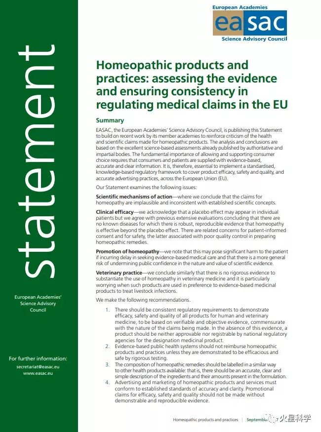 这份声明认为,没有证据能够证明顺势疗法能够治疗任何疾病或者症状,即使在部分患者身上可能可以观察到安慰剂效应。声明核心就是顺势疗法缺乏有效性证据,不仅如此,使用顺势疗法可能延误患者接受经证据检验的有效治疗。在医学监管上,应建立标准化的,以知识为基础的框架,来评价医疗产品的有效性,安全性,质量保障,并且提供相应的医疗服务。欧洲科学机构对自己的传统医学毫不手软,甚至不肯嘴软。上文中甚至说,顺势疗法是有害的,包括降低患者和公众对科学证据的信心。传统医学损害的不仅仅是民众的身体健康,也同样损害民众的科学认知。